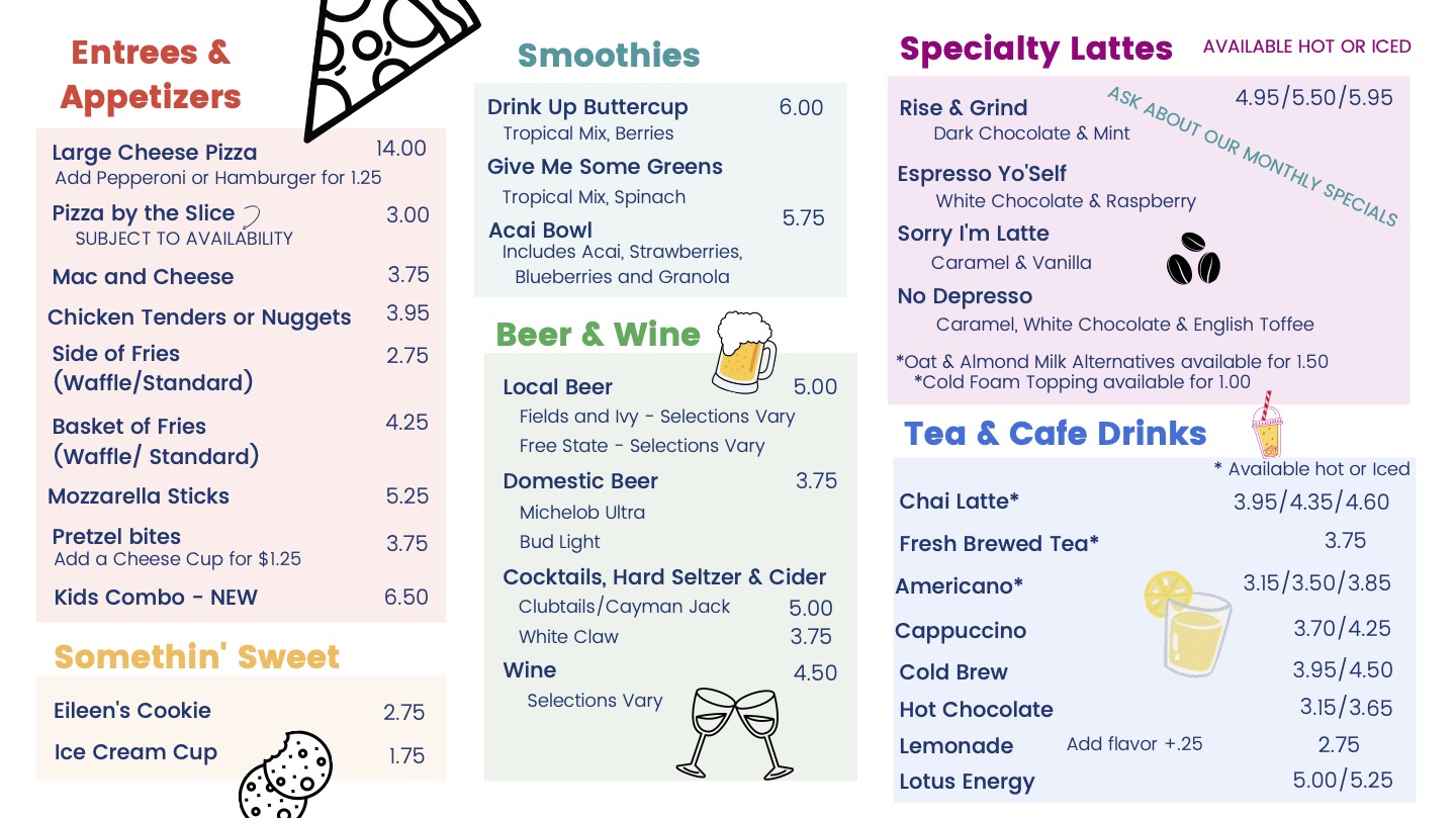 We know how important a good cup of coffee can be in your daily routine and we have just what you need. We also offer a variety of other drinks and snacks, as well as pizza.
